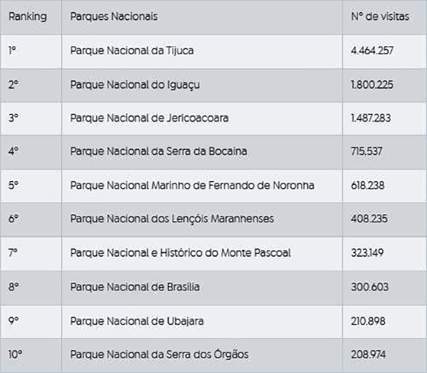 O Parque Nacional da Tijuca, o maior parque urbano do mundo, instalado na cidade do Rio de Janeiro, segue como líder do ranking de visitas. Em 2023, o lugar alcançou pela primeira vez a marca histórica de mais de 4 milhões de pessoas. A unidade passou de 3.542.778 frequentadores em 2022 para 4.464.257 no último ano. Suas trilhas, cachoeiras e vistas panorâmicas continuam a cativar brasileiros e estrangeiros, oferecendo passeios e caminhadas no meio da floresta.