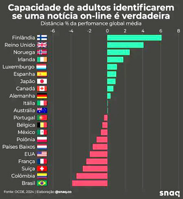 consultoria Snaq mostra o Brasil em último lugar quando é medida a capacidade de pessoas adultas identificarem se uma notícia publicada online é verdadeira ou falsa, atrás de Colômbia, Suíça, França e Estados Unidos.