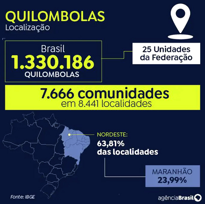 A população quilombola no país era formada por 7.666 comunidades que habitavam 8.441 localidades em 25 Unidades da Federação. Esse conjunto