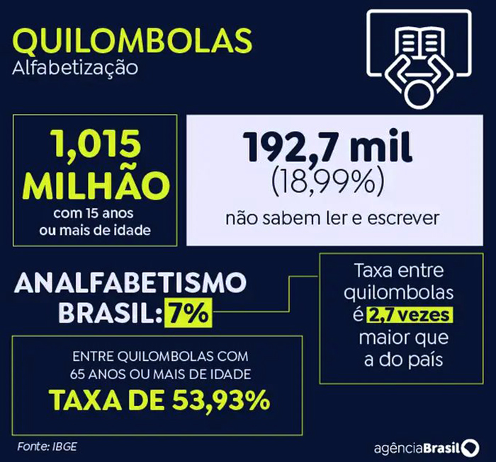 A taxa quilombola representa 192,7 mil pessoas com 15 anos ou mais de idade que não sabem ler e escrever nem ao menos um bilhete simples. De acordo com o levantamento censitário, o país tem 1,330 milhão de pessoas quilombolas, sendo 1,015 milhão com 15 anos ou mais de idade.