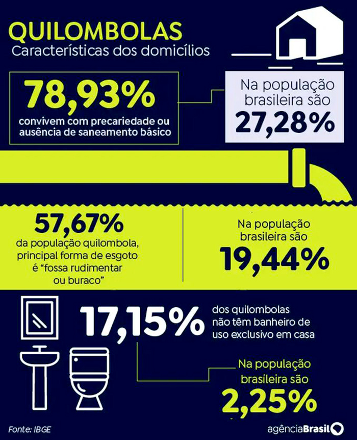 De cada dez quilombolas no país, praticamente oito vivem em lares com saneamento básico precário ou ausente. São 1,048 milhão de pessoas que moram em 357,1 mil lares. Isso representa 78,93% dos 1,3 milhão de quilombolas que habitam domicílios permanentes ocupados. Essa proporção é 2,89 vezes maior que a da população brasileira (27,28%).