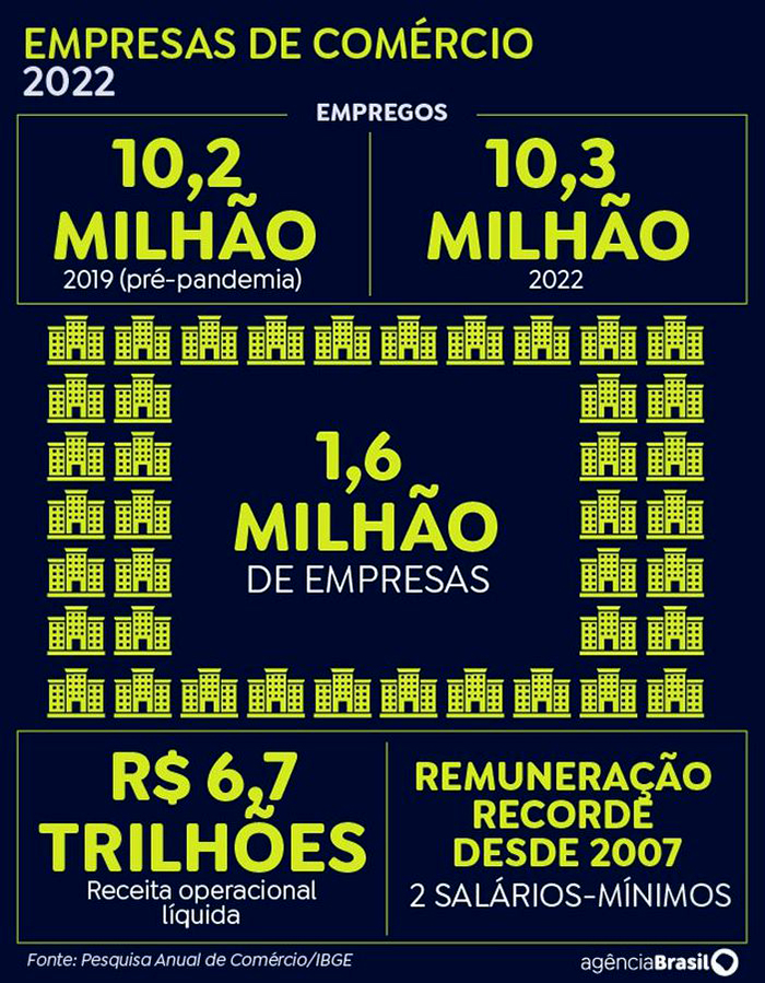 O comércio varejista é o carro-chefe na ocupação de trabalhadores, com 7,6 milhões de empregos em 2022. O atacado responde por 1,9 milhão, o maior da série histórica, e o comércio de veículos automotores, peças e motocicletas emprega 846,2 mil.