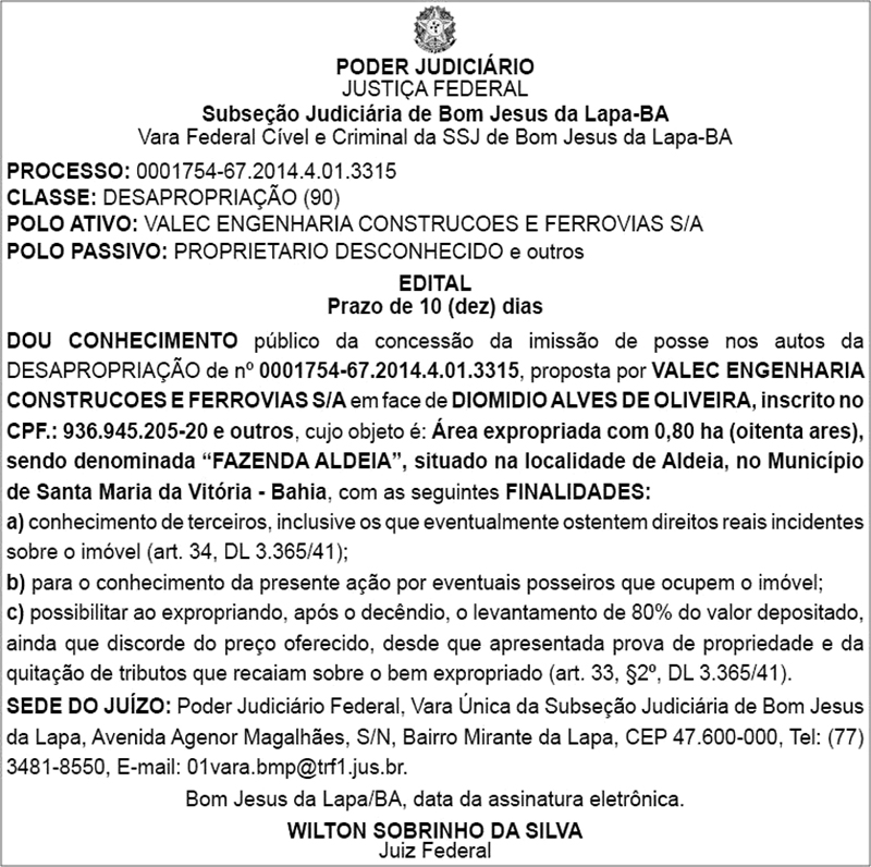JUSTIÇA FEDERAL - SUBSEÇÃO JUDICIÁRIA DE BOM JESUS DA LAPA (BA) - EDITAL DE DESAPROPRIAÇÃO - PROPRIETÁRIO DESCONHECIDO E OUTROS - FAZENDA ALDEIA NO MUNICÍPIO DE SANTA MARIA DA VITÓRIA - BAHIA