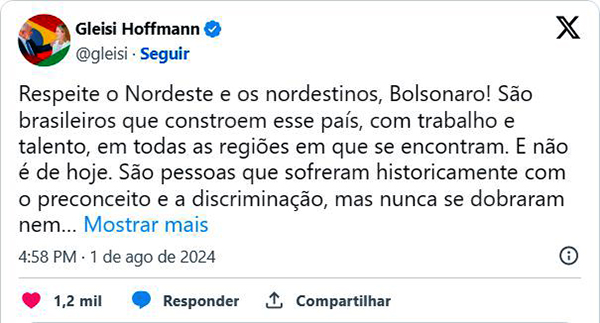 A fala de Gleisi ocorreu após o extremista atacar novamente a região Nordeste. Suas declarações rapidamente viralizaram nas redes sociais no último domingo (28).