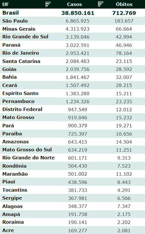 As secretarias estaduais de Saúde contabilizaram, desde o início da pandemia, em todo o país 38.850.161 diagnósticos positivos e 712.769 mortes em decorrência da Covid-19.