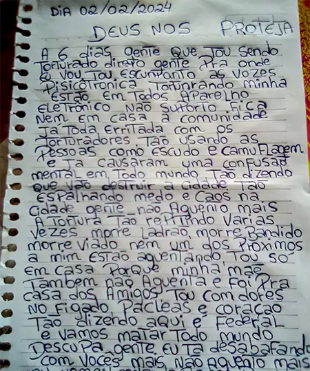 “Sou mais uma vítima das chamadas armas psicotrônicas, cuja ação ninguém é capaz de enxergar. E que suspeito que estão sendo usadas contra mim por traficantes do bairro onde moro, que agem impunemente. Não consigo escrever mais porque, além de gravarem tudo que faço e penso, eles me causam um sofrimento que só quem passa conhece. Se não morrer, em breve volto a escrever, mas venho outra vez pedir ajuda”, acrescentou R.S.B.