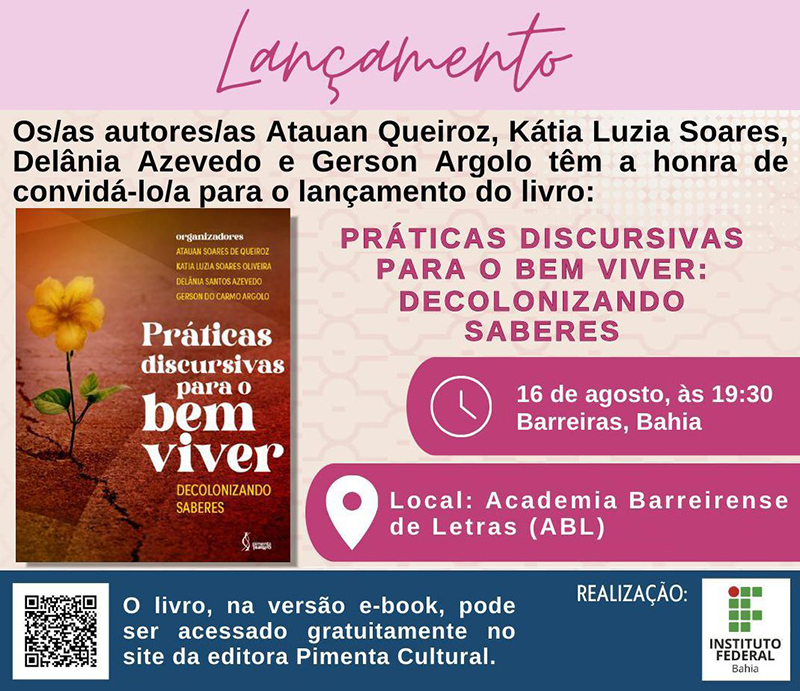 A Academia Barreirense de Letras (ABL) vai sediar na próxima sexta-feira (16) o lançamento do livro ‘Práticas discursivas para o Bem Viver: decolonizando saberes’. Com início às 19h30, o evento reunirá membros da instituição, convidados, estudantes, professores e demais representantes do Instituto Federal de Educação, Ciência e Tecnologia da Bahia (IFBA), Campus Barreiras.