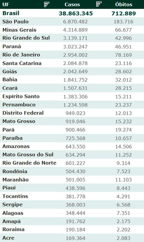 As secretarias estaduais de Saúde contabilizaram, desde o início da pandemia, em todo o país 38.863.345 diagnósticos positivos e 712.889 mortes em decorrência da Covid-19.