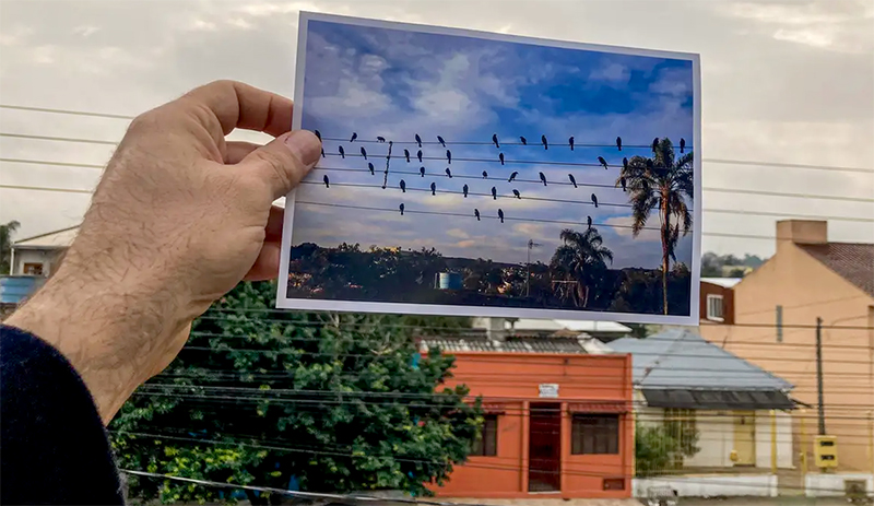 “Minha ideia era fotografar com a máquina no chão, para pegar aqueles passarinhos se alimentando e dar a sensação de que eles eram maiores. Eu fiz isso. Só que quando eu olhei pra cima, nos fios, estava aquele montão de passarinhos esperando a sua vez de comer”, recorda-se o fotógrafo. Ele fez várias fotos dessa posição e reparou nos pássaros distribuídos nos fios como em uma pauta musical: “mas que estranho, parece uma partitura aquilo ali.”
