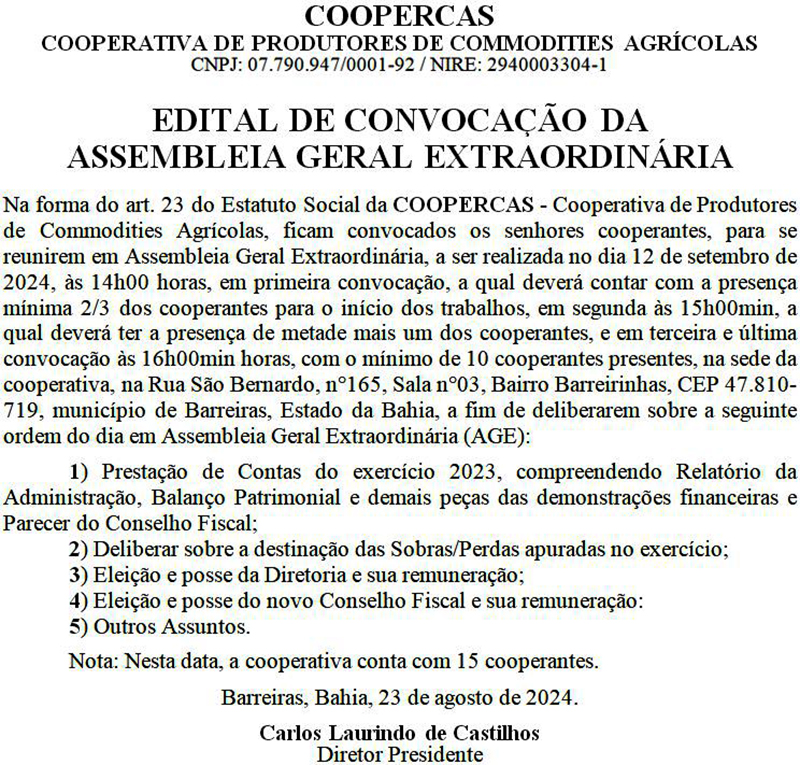 COOPERCAS - EDITAL DE CONVOCAÇÃO DA ASSEMBLEIA GERAL EXTRAORDINÁRIA