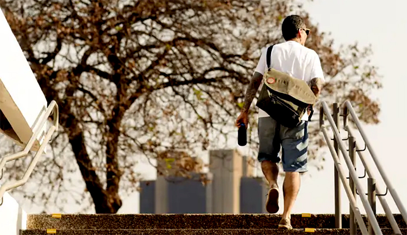 Seca e alta temperatura em Brasília. Pessoa com garrafa de água passa