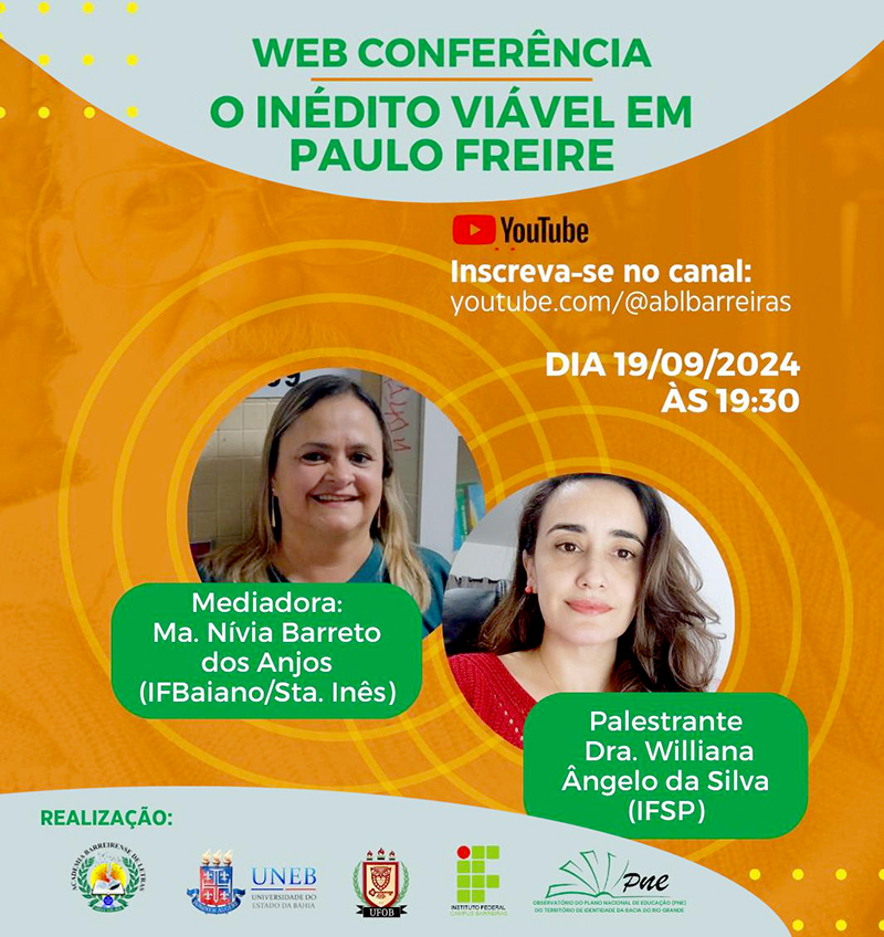 O Inédito Viável em Paulo Freire’ é o tema da 1ª Webconferência da 4ª edição do projeto de extensão ‘Princípios Pedagógicos Freireanos: Possibilidade Formativa’, promovido pela Academia Barreirense de Letras (ABL), que acontece amanhã (19).