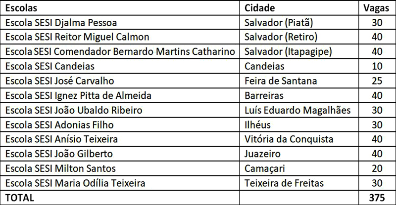 As vagas serão exclusivas para ingresso na Formação Técnica e Profissional e para estudantes com renda familiar líquida familiar de até 2,5 (dois e meio) salários mínimos. Estão incluídas no processo seletivo as 12 escolas da Rede SESI em toda a Bahia, localizadas em Salvador e Região Metropolitana e no interior (ver quadro abaixo).