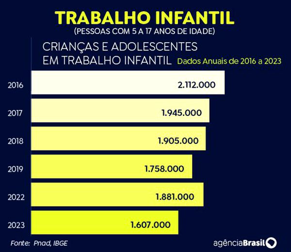 De acordo com o IBGE, de 2016 a 2019, o trabalho infantil apresentou quedas anuais, passando de 2,112 milhões no primeiro ano da série histórica para 1,758 milhão em 2019.