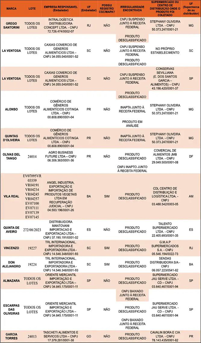 As doze marcas desclassificadas por fraudar seus produtos são a Grego Santorini; La Ventosa; Alonso; Quintas D’Oliveira; Olivas Del Tango; Vila Real; Quinta de Aveiro; Vincenzo; Don Alejandro; Almazara; Escarpas das Oliveiras e Garcia Torres.