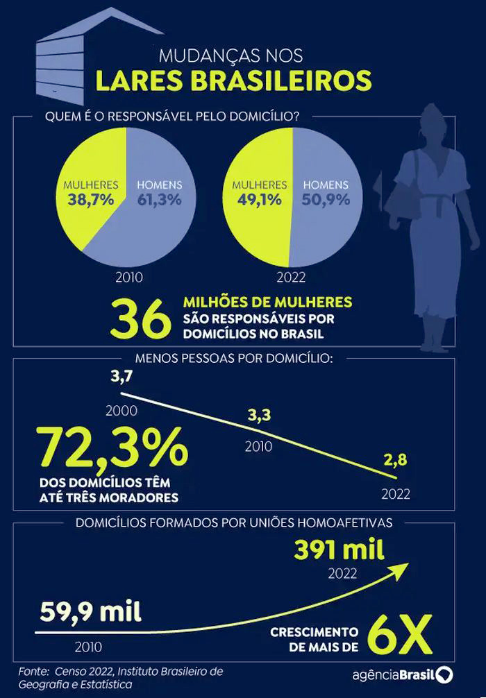 O perfil do responsável acompanha muito as mudanças observadas no total da população nos dois últimos censos, quando a gente observou também um aumento da população parda e preta em relação ao censo anterior. Isso também está representado aqui no perfil da pessoa responsável pelo domicílio. Pela primeira vez, observa-se que os pardos superam as pessoas brancas na quantidade de pessoas responsáveis pelos domicílios do Brasil”, afirmou.