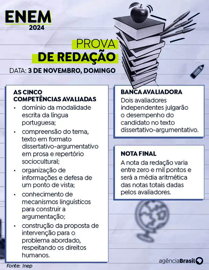 O texto produzido será corrigido por, no mínimo, dois avaliadores graduados em letras ou linguística, de forma independente, sem que um conheça a nota atribuída pelo outro. Cada avaliador poderá atribuir nota entre 0 e 200 pontos a cada uma das cinco competências cobradas,que, juntas, podem somar 1.000 pontos.