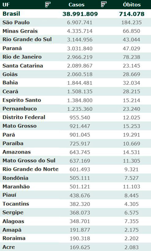 As secretarias estaduais de Saúde contabilizaram, desde o início da pandemia, em todo o país 38.991.809 diagnósticos positivos e 714.078 mortes em decorrência da Covid-19.