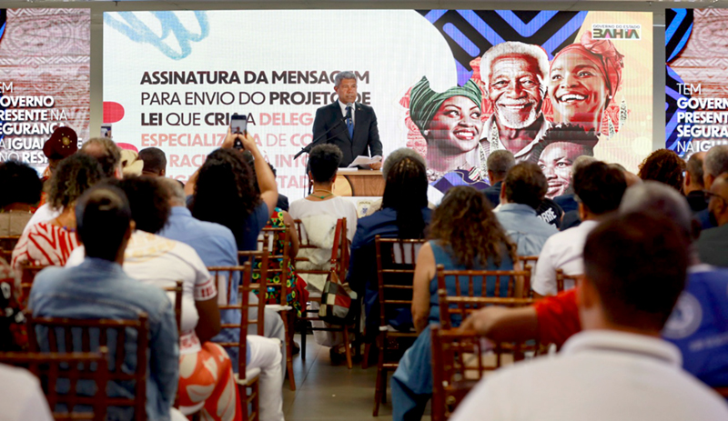 “É um passo essencial para garantir a segurança e o respeito à diversidade no nosso estado”. Assim o governador Jerônimo Rodrigues iniciou o discurso na cerimônia de assinatura da mensagem do projeto de lei (PL) que autoriza a criação da Delegacia Especializada de Repressão aos Crimes por Discriminação e Intolerância Racial e Religiosa (Decrin), realizada nesta quarta-feira (13), no Centro de Operações e Inteligência (COI), em Salvador.