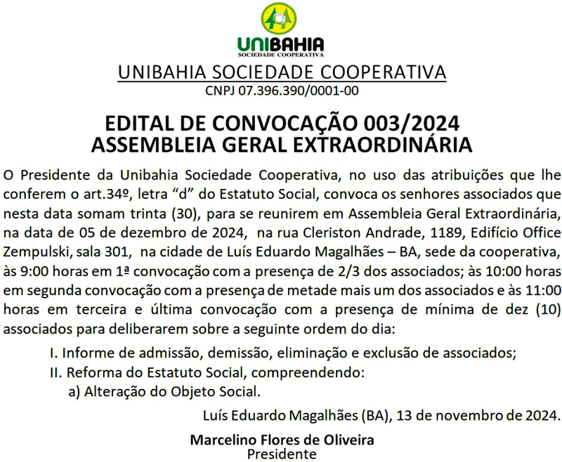 UNIBAHIA_EDITAL DE CONVOCAÇÃO 003/2024 ASSEMBLEIA EXTRAORDINÁRIA