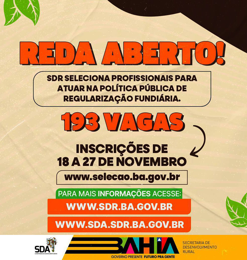 A Secretaria de Desenvolvimento Rural (SDR) divulgou, no Diário Oficial desta quinta-feira (14), edital para contratação de 193 novos profissionais em Regime Especial de Direito Administrativo (REDA), para atuação em suas unidades na capital baiana. O objetivo é dar celeridade aos serviços prestados, aprimorando a qualidade das ações executadas e garantindo maior eficiência no atendimento às demandas do rural baiano, sobretudo em áreas prioritárias, como a da regularização fundiária.