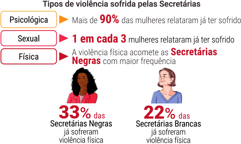 Os dados destacam ainda que uma em cada quatro Secretárias relataram episódios de violência física, muitas vezes em forma de toques sem consentimento durante reuniões ou debates. As Secretárias negras enfrentam índices ainda mais altos: 33% afirmaram já ter sofrido violência física, enquanto entre as brancas o percentual foi de 22%.