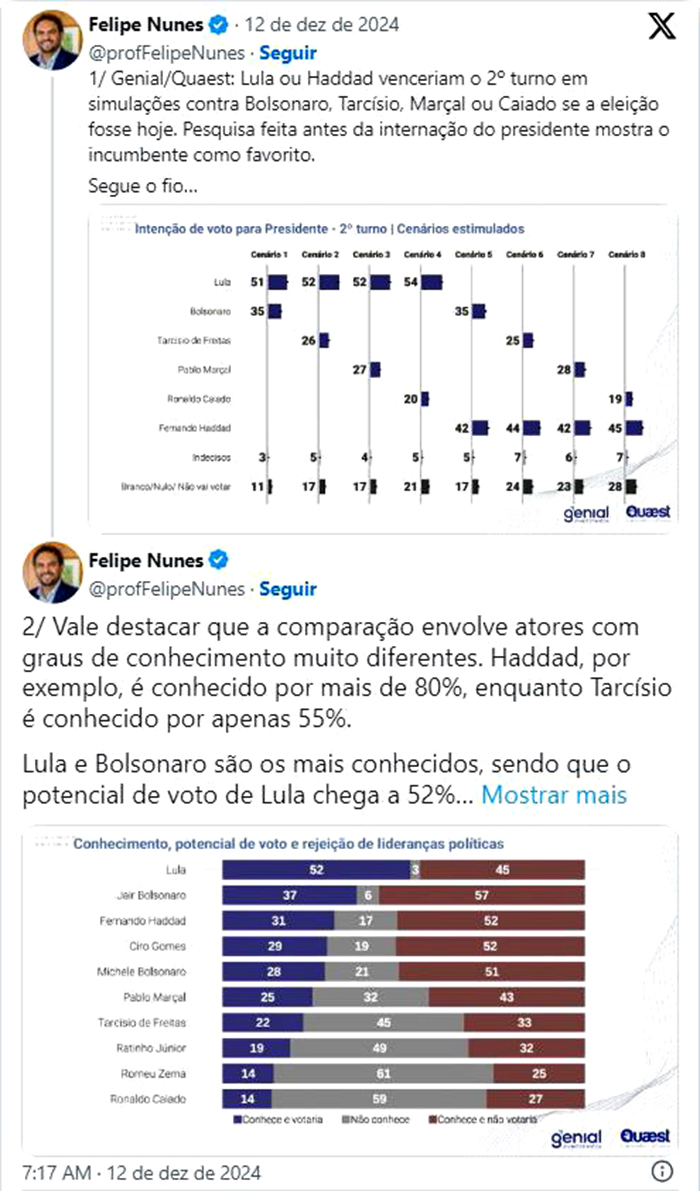 A pesquisa entrevistou 8.598 eleitores presencialmente entre 4 e 9 de dezembro, com margem de erro de um ponto percentual para mais ou para menos.