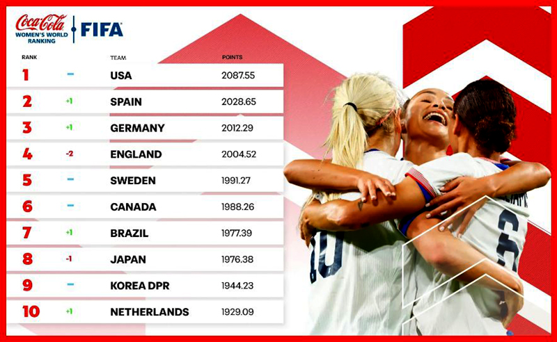 O ranking de seleções femininas da Fifa é liderado pelos Estados Unidos, com 2.087,55 pontos, tem a Espanha na segunda posição, com 2.028,65 pontos, e a Alemanha como terceira colocada, com 2.012,29 pontos.