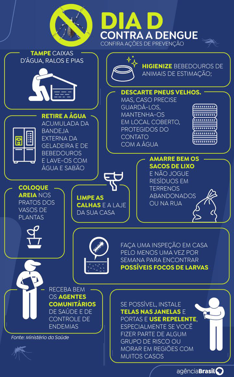 O Dia D de Mobilização contra a Dengue, programado para este sábado (14), terá ações em todo o Brasil. O objetivo é conscientizar a população para prevenir a proliferação do mosquito Aedes aegypt, que transmite o vírus causador da doença.