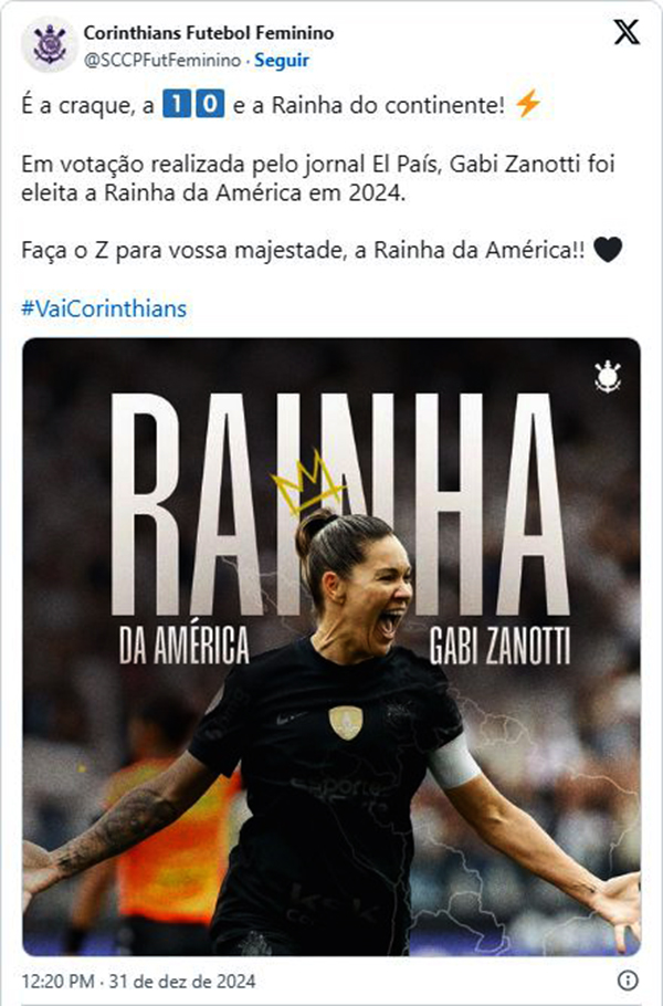 A versão feminina do prêmio também foi dominada por um time brasileiro, o Corinthians, equipe que em 2024 conquistou a Série A1 do Brasileiro, a Supercopa do Brasil e a Libertadores. A meia-atacante Gabi Zanotti foi escolhida a Rainha da América, Gabi Portilho ficou em segundo lugar e Vic Albuquerque em terceiro.