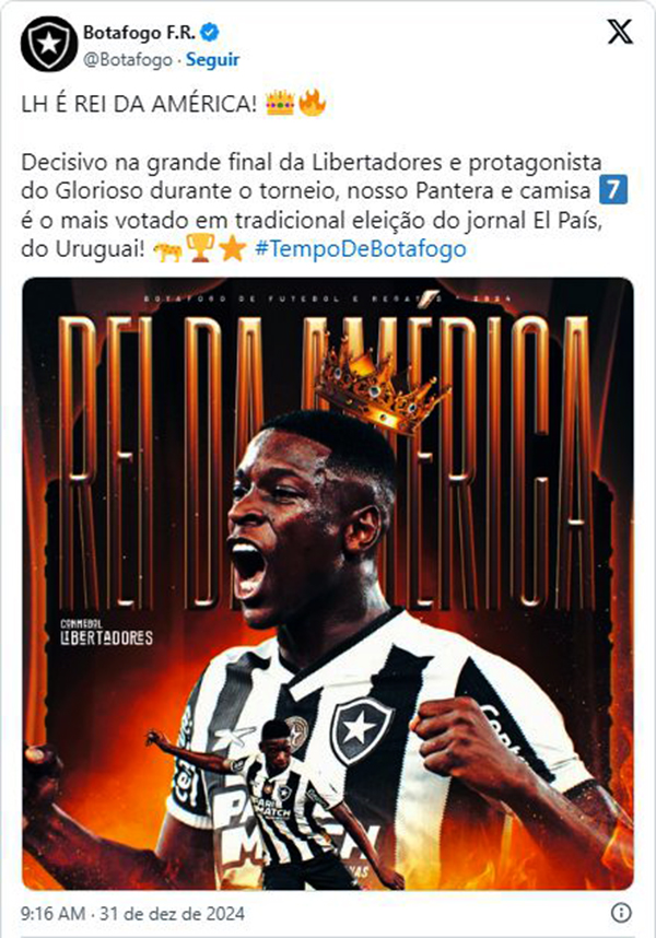 “Acordei com uma notícia super incrível, sou oficialmente o Rei da América. Primeiramente é agradecer a Deus, por tudo que passei esse ano. Também agradecer ao Botafogo, a essa torcida maravilhosa, a meus companheiros, que me ajudaram. Estou muito feliz mesmo”, declarou Luiz Henrique em uma postagem nas redes sociais.