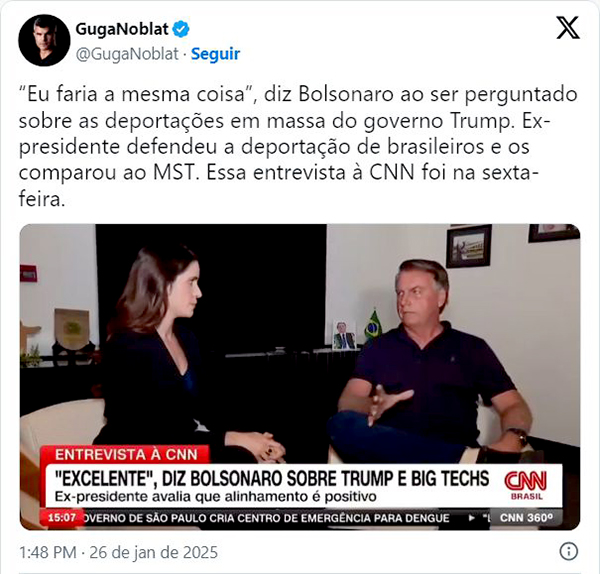 O ex-presidente Jair Bolsonaro (PL) disse na última sexta-feira (24) que faria “a mesma coisa” que o presidente dos Estados Unidos, Donald Trump, em relação à política de deportações em massa. Em entrevista à CNN Brasil, Bolsonaro defendeu a iniciativa de Trump, justificando que muitos dos imigrantes não tinham sequer “qualificação” para ir aos EUA.