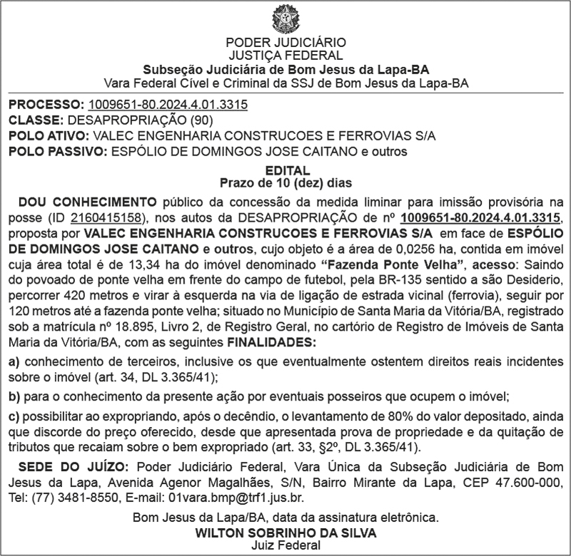 JUSTIÇA FEDERAL - SUBSEÇÃO JUDICIÁRIA DE BOM JESUS DA LAPA (BA) - EDITAL DE DESAPROPRIAÇÃO - MARIQUINHA MESSIAS DE SOUSA - FAZENDA MARAVILHA RIO CACHEADO NO MUNICÍPIO DE SÃO DESIDÉRIO - BAHIA