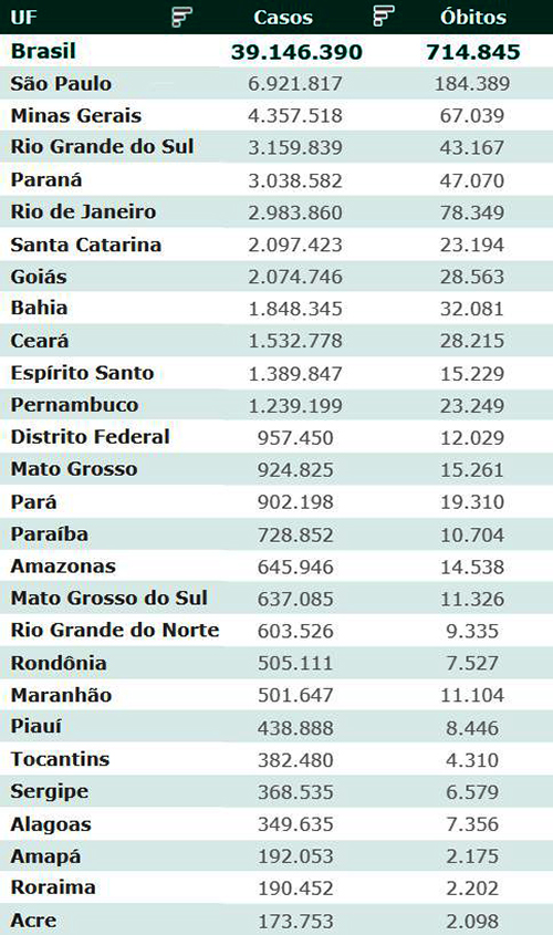 As secretarias estaduais de Saúde contabilizaram, desde o início da pandemia, em todo o país 39.146.390 diagnósticos positivos e 714.845 mortes em decorrência da Covid-19.