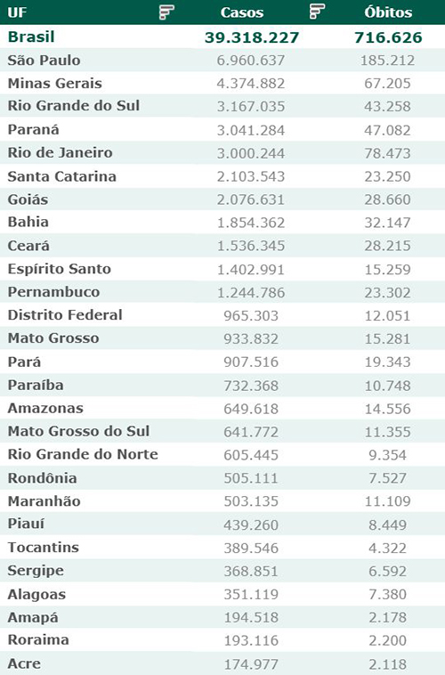 As secretarias estaduais de Saúde contabilizaram, desde o início da pandemia, em todo o país 39.318.227 diagnósticos positivos e 716.626 mortes em decorrência da Covid-19.
