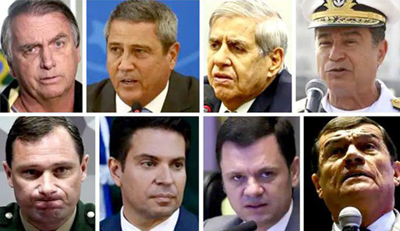 Da esquerda para direita: Ex.presidente, Jair Bolsonaro, General, Braga Neto, General, Augusto Heleno, Almirante, Almir Garnier, Tenete-Coronel, Mauro Cid, Deputado Federal, Alexandre Ramagem, Ex.ministro da justiça, Anderson Torres, General Paulo Sérgio Nogueira © Agência Brasil