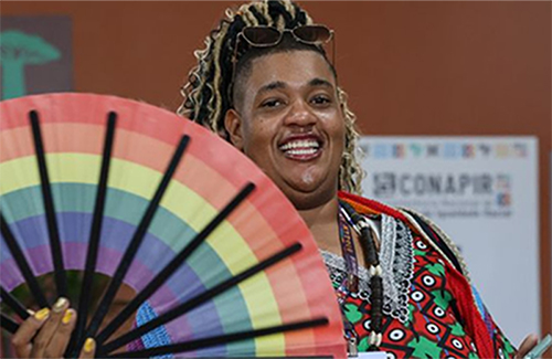 Com leque de cores do arco-íris na mão, Vinny circulou nos ambientes da Conapir, chamando a atenção. Ele deseja ampliar a representatividade negra em espaços de poder, decisão e visibilidade, como na política, na mídia, nas artes, no mercado de trabalho e nas comunidades acadêmicas.