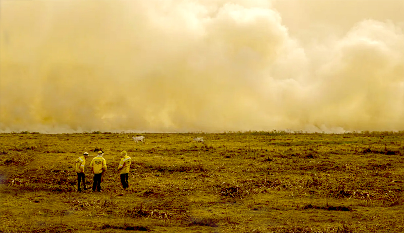Brigadistas do Icmbio observam cortina de fumaça por conta do incêndio