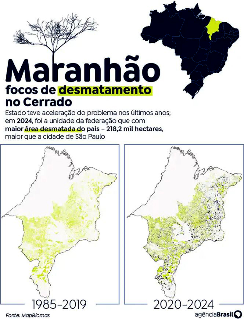 Já o Maranhão foi, pelo segundo ano consecutivo, o estado que mais suprimiu vegetação nativa do Brasil, chegando a 17,6% do total desmatado em 2024, o que representou 218 mil hectares, área bem maior que a cidade de São Paulo (152 mil ha).