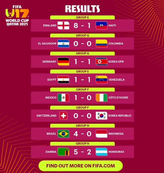 O Mundial Sub-17 vai até 27 de novembro. Ao todo 48 seleções – divididas em 12 grupos - iniciaram a competição. Somente as duas melhores equipe de cada chave seguem para o mata-mata.
