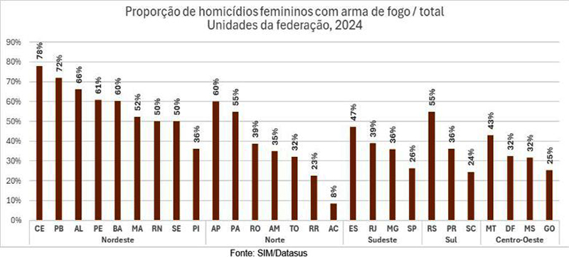 Já em relação aos estados, a vitimização de mulheres por armas de fogo varia bastante. No Ceará, 78% das mulheres assassinadas morreram em episódios de violência armada, proporção seguida por Paraíba, Alagoas, Pernambuco e Bahia. No extremo oposto, o Acre registra o menor percentual do país (8%), muito abaixo dos demais; depois aparecem, com ampla diferença, Roraima (23%), Santa Catarina (24%) e Goiânia (24%).