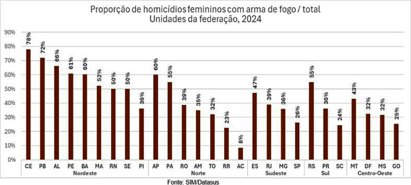 O uso de arma de fogo é mais frequente no Nordeste: 62% dos homicídios de mulheres na região ocorreram dessa forma em 2024. Em seguida aparecem o Centro-Oeste (42%) e o Norte (41%). As menores proporções são observadas no Sudeste (35%) e no Sul (33%). O Norte também se destaca negativamente por apresentar a maior taxa de homicídios femininos cometidos por outros meios, logo à frente do Centro-Oeste.