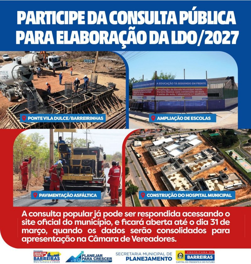 A Prefeitura de Barreiras, por meio da Secretaria de Planejamento, iniciou o processo de elaboração da Lei de Diretrizes Orçamentárias (LDO) 2027 com a abertura de consulta pública para ouvir a população sobre as prioridades de investimentos e ações da administração municipal para o próximo exercício. A participação pode ser feita por meio de um formulário disponibilizado no site oficial do município.