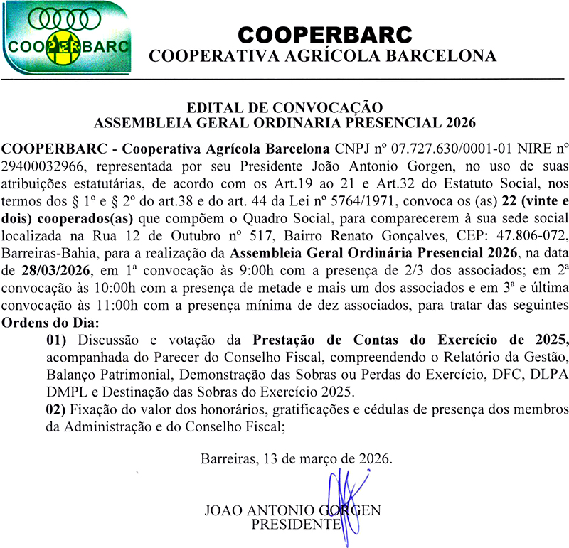 COOPERBARC- EDITAL DE CONVOCAÇÃO - ASSEMBLEIA GERAL ORDINÁRIA PRESENCIAL 2026