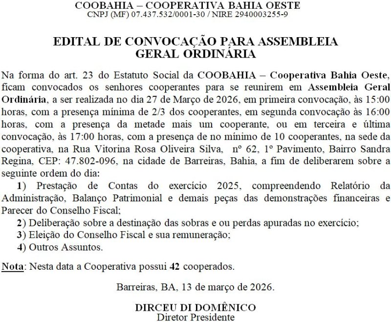 COOBAHIA- EDITAL DE CONVOCAÇÃO - ASSEMBLEIA GERAL ORDINÁRIA