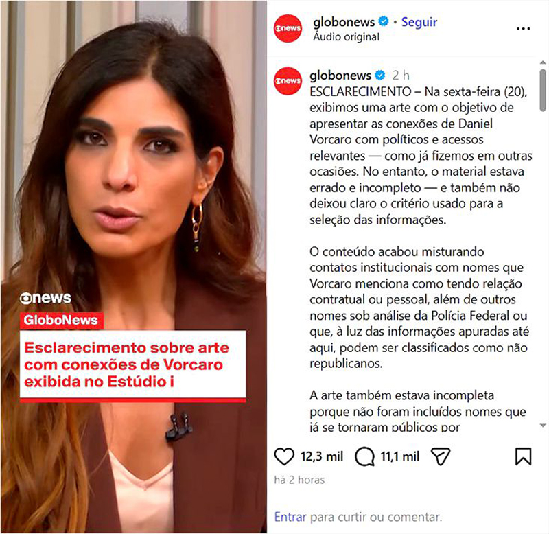 “Na última sexta, a gente exibiu aqui uma arte com o objetivo de apresentar as conexões do Word com políticos e acessos relevantes. Como a gente já fez em outras ocasiões, no entanto, o material estava errado e incompleto e também não deixou claro o critério que foi usado para a seleção das informações. Esse conteúdo acabou misturando contatos institucionais com nomes que marcaram, menciona como tendo relação contratual ou pessoal, além de outros nomes sob análise da PF, ou que a luz das informações apuradas até aqui podem ser classificados como não republicanos. A arte também estava incompleta porque não foram incluídos nomes que já se tornaram públicos por envolvimento com caso master, como ministros do Supremo e políticos nem ex-diretores do Banco Central, que estão sob escrutínio da polícia por suspeita de corrupção na relação com o banqueiro. Diante de um material incompleto e em desacordo com os nossos princípios editoriais, a gente pede desculpas.”