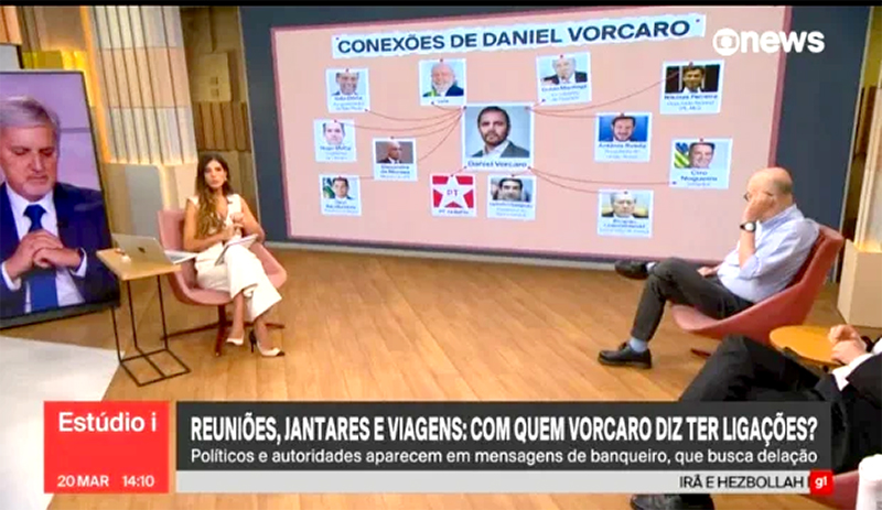 A arte gráfica exibida no Estúdio I destacou nomes ligados a Daniel Vorcaro. No que se refere à menção sobre o presidente Lula, a associação foi feita com base apenas em uma reunião oficial entre o presidente e o banqueiro investigado, sem evidências de irregularidade. Foi justamente o governo Lula que tomou providências contra o esquema fraudulento de Vorcaro.