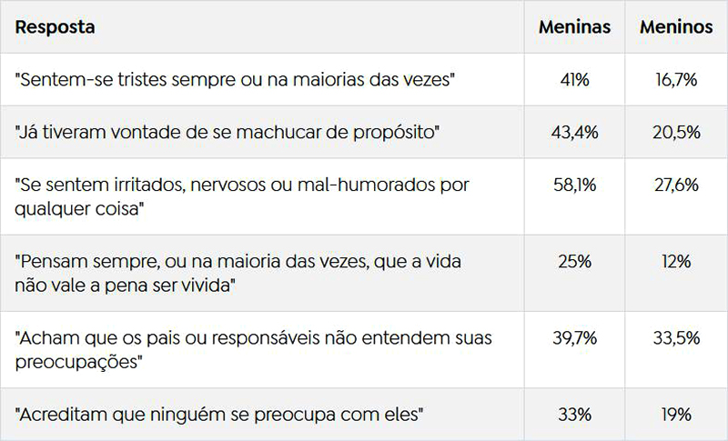 O quadro preocupante sobre a saúde mental dessa população inclui ainda 42,9% dos alunos que responderam que se sentem “irritados, nervosos ou mal-humorados por qualquer coisa” e 18,5% que pensam sempre, ou na maioria das vezes, que “a vida não vale a pena ser vivida”.