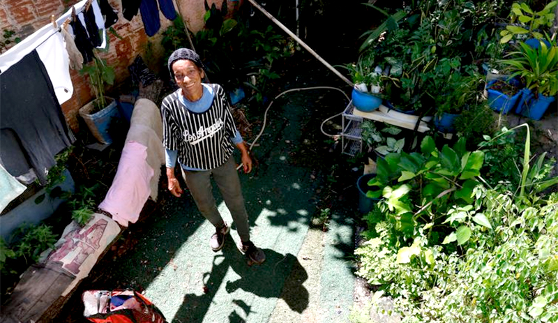Com um quintal fresco, não é só na horta comunitária que ela cultiva memórias. "Está sentindo esse cheiro? São as minhas plantas. Tem saião, alfavaca, assa-peixe, ora-pro-nóbis, do grande, que dá uma flor rosa, bem bonita", apresenta a erveira.