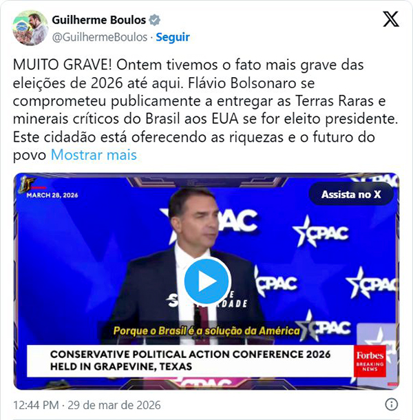 O ministro Guilherme Boulos (PSOL-SP) disse que a fala do senador representa “o fato mais grave das eleições de 2026 até aqui”. Segundo ele, Flávio Bolsonaro teria se comprometido publicamente a entregar recursos estratégicos do país em troca de apoio externo. O deputado Lindbergh Farias (PT-RJ) chamou o senador de “traidor da pátria” e “vendilhão de Trump”.